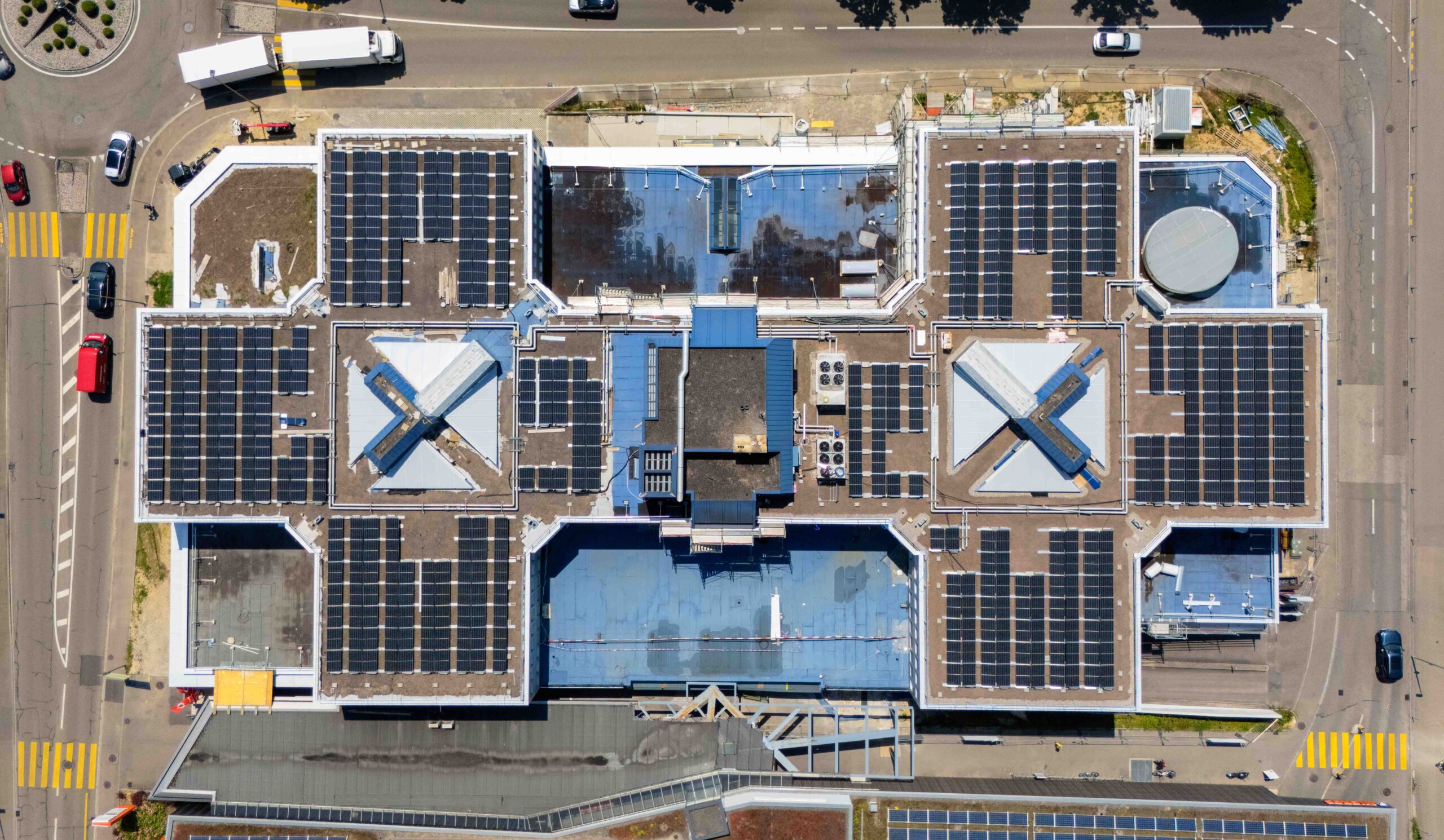 Die Installation einer grossflächigen Photovoltaikanlage auf dem Dach bot sich als konsequenter Schritt an – integriert in die bauliche Erneuerung und abgestimmt auf die Anforderungen eines stark frequentierten Standorts.