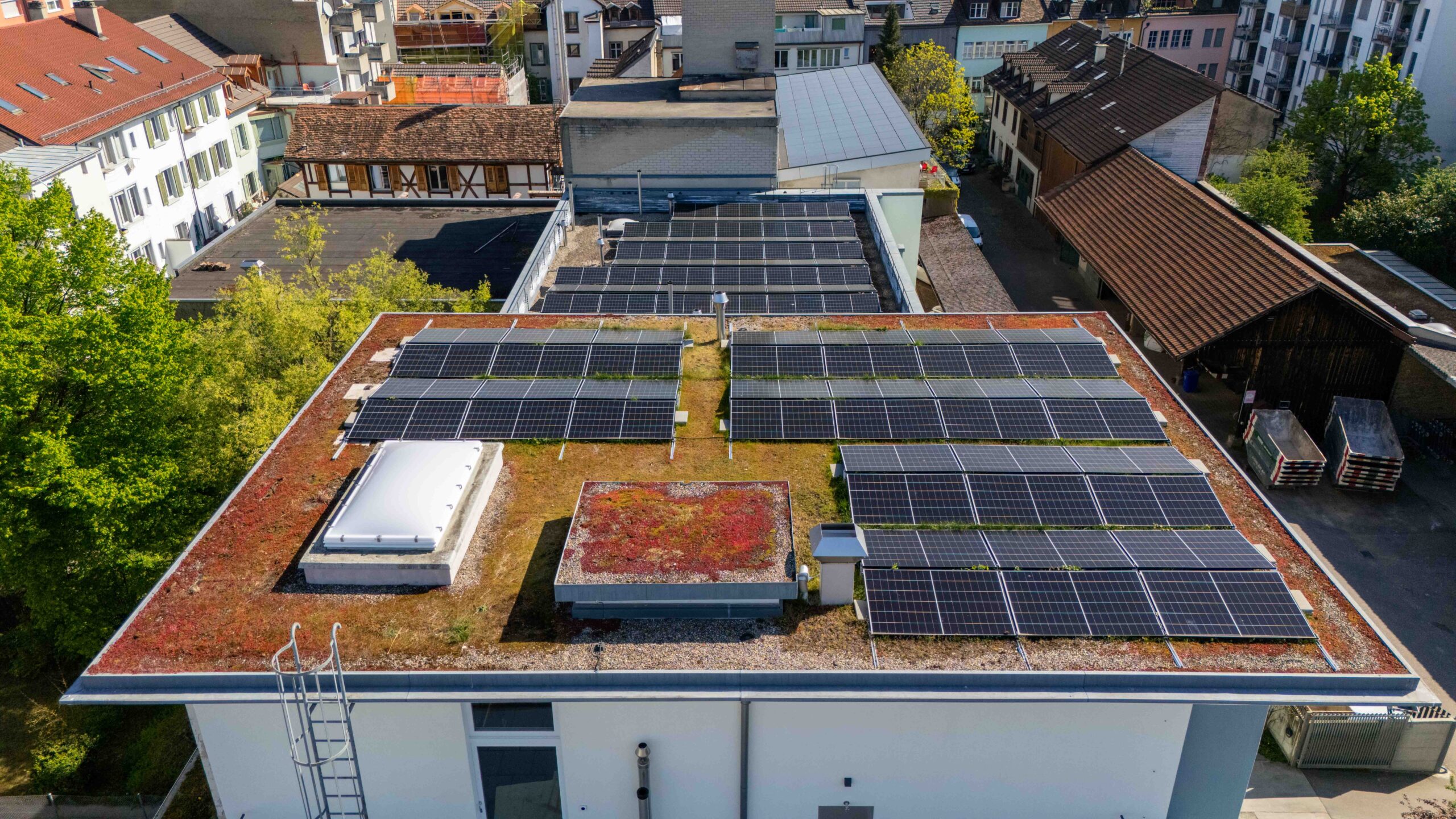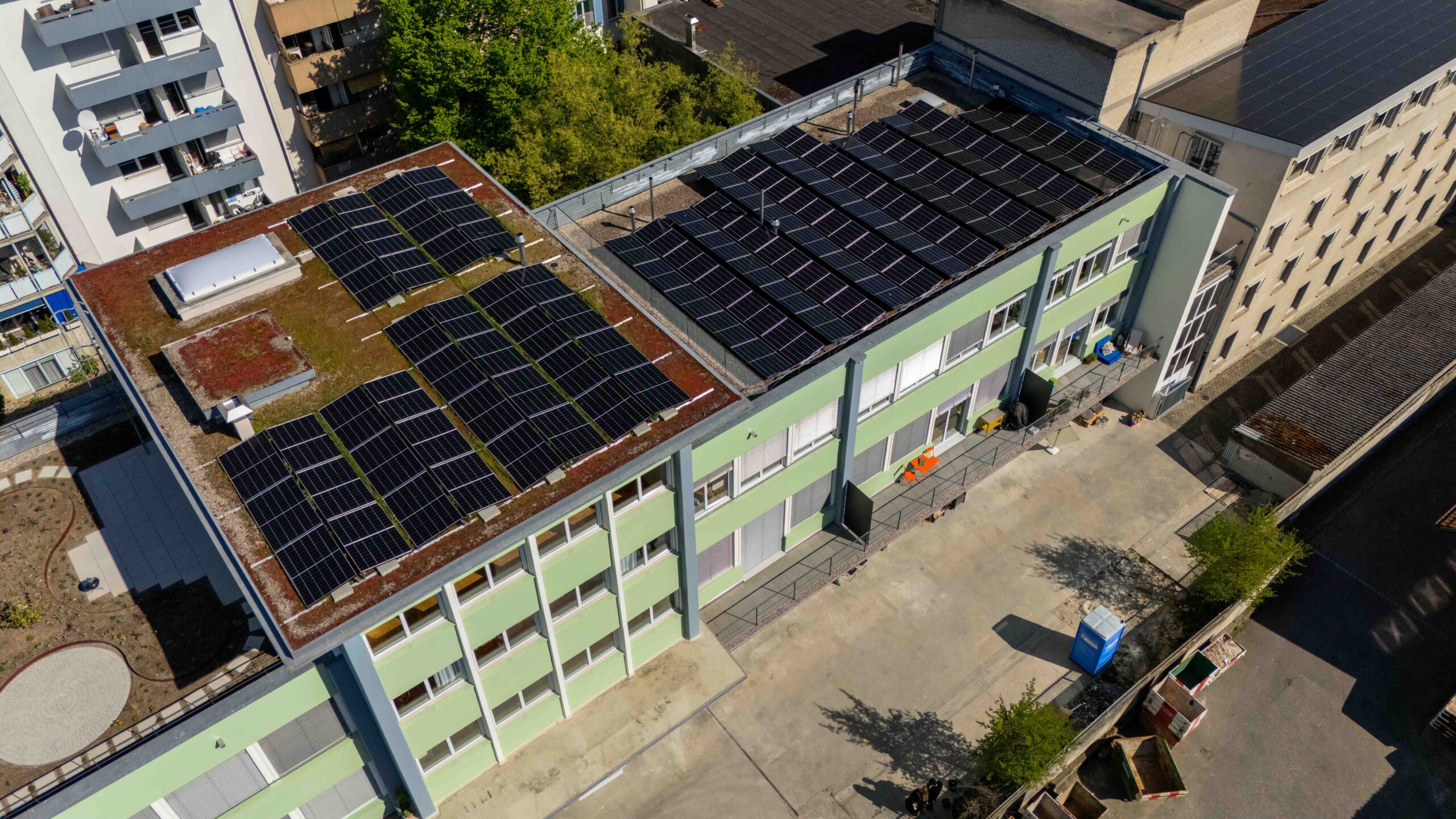 Die Photovoltaikanlage wurde als aufgeständerte Lösung über einer Grünbedachung umgesetzt. Dadurch konnten ökologische und energetische Aspekte optimal kombiniert werden.