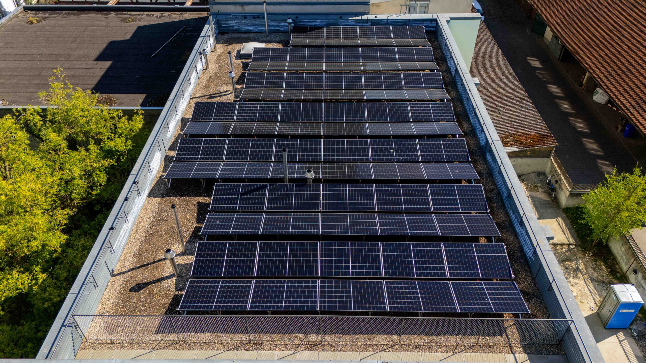 Zum Einsatz kamen Aiko Module mit 470 Wp, die eine hohe Leistungsdichte und Effizienz gewährleisten. Die Anlage wurde gezielt auf den Eigenverbrauch der Liegenschaft ausgelegt, sodass der produzierte Solarstrom direkt vor Ort genutzt werden kann.